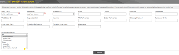 a. Transaction History Report – Transaction History Report is the one used most frequently. You should use this report to view detailed transaction history against predefined criteria. These criteria include date ranges, movement types, locations and traceable information. Please note that multiple movement types can be selected by holding down the control key.