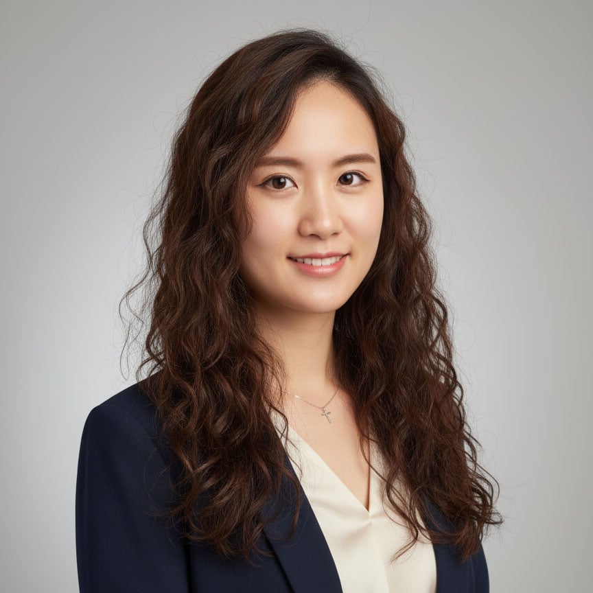 Asian woman in professional attire with long hair, smiling against gray background.