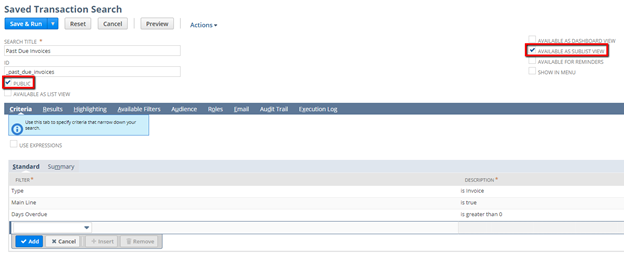 It’s important to call out two header-level options that must be selected in order for your saved search to properly function as a sublist – Public and Available as a Sublist View.  Users must have access to the search in order to see the sublist data (hence the “Public” option) and only saved searches designated as Available as Sublist View will be available for selection as sublists.  If you would prefer to limit your sublist to only a particular set of users or roles, you can leave Public unchecked and configure this on the Audience subtab instead.