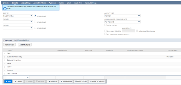 You can create a custom sublist using a saved search or by designating a parent record on a custom record.  Let’s start with the saved search method.  For this example, I’ll be creating a sublist to display past due invoices on a customer record.  I’ll start by defining my criteria, just as I would with a typical saved search.  Note: If you’re new to saved searches, be sure to take a look at our previous blog posts covering saved search functionality in more detail.