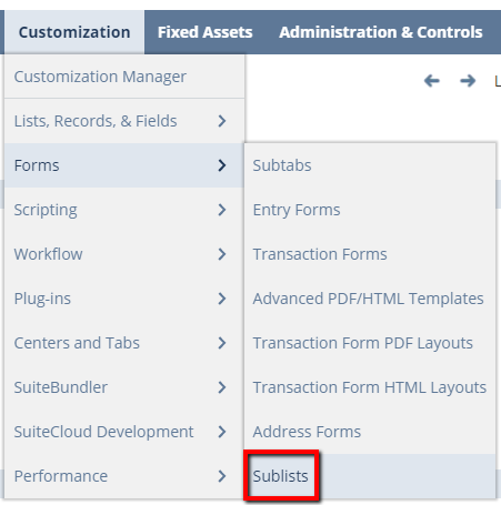 Now that my saved search has been built, I can expose the results as a sublist on the customer record.  You can create a custom subtab to expose your sublist on, but I’ll be adding it to the standard Sales subtab on the customer record for this example.  Navigate to Customization > Forms > Sublists.