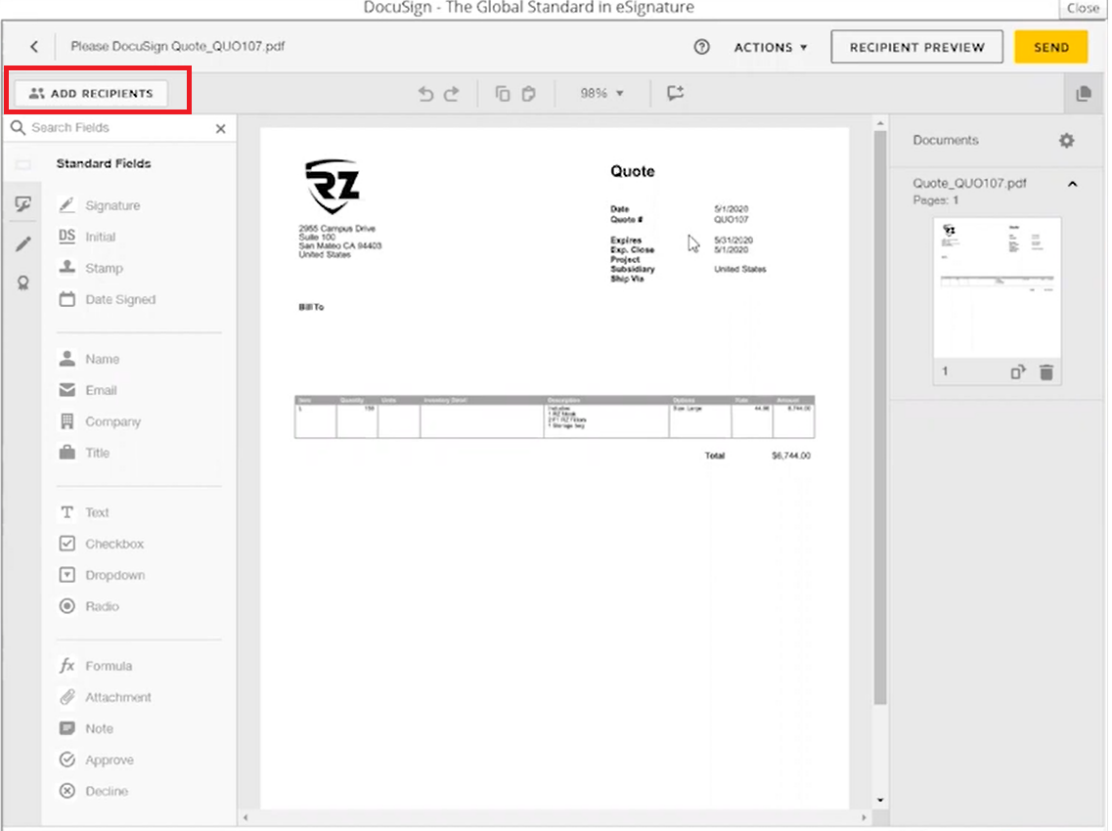- Click the button and the DocuSign window pops up with the PDF version of the record you are working from. Here is an example from the Quote record.