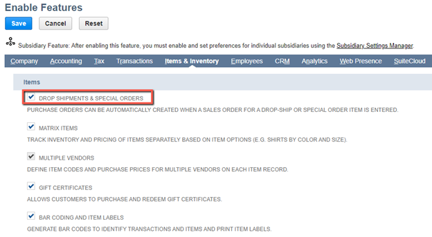 To set up your NetSuite ERP for drop shipments and special orders, navigate to Setup > Company > Enable Features > Items & Inventory and select the Drop Shipments & Special Orders option: