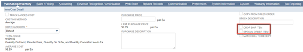 By selecting either of these options, you are allowing the system to automatically generate a drop ship or special order purchase order every time that item appears on a sales order, which means that you will lose the ability to fulfill an order with on-hand stock. An item can be flagged as either a Drop Ship Item or a Special Order Item, but not both. If one of these checkboxes is checked, a preferred vendor and purchase price must also be entered on that item.