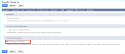 - Enable SuiteAnalytics Workbook feature on the Enable Features page