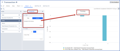 Chart properties can be adjusted. For example, changing the name of the chart as well as the X/Y axis labels.