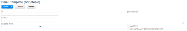 Start by navigating to Documents > Templates > Email Templates > New.  At the header level, define a Name, ID, and Description for the template.  Also, if you’d like to limit the template’s availability to only a specific record type (i.e. emails generated from customer records), select the record in the Record Type dropdown.