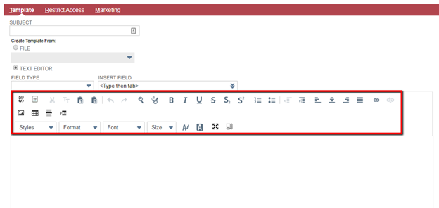 From there, you can begin configuring the content of your email.  Enter the Subject (which can include references to NetSuite fields by using the format ${[Record].[Field] – i.e. ${transaction.id}}) and define whether you will be referencing an HTML file uploaded to the File Cabinet or entering your code in the Text Editor for the body content.  While both options work the same, I prefer creating my code in an HTML editor outside of NetSuite and pasting it into the source code view of the Text Editor because it allows me to preview the content within the template itself.  If you are not comfortable working with HTML, don’t worry!  The Text Editor interface has many formatting options built right in, so you can use the graphical interface to make text bold, add images, adjust font faces and sizes, and much more.