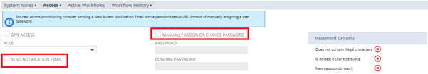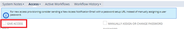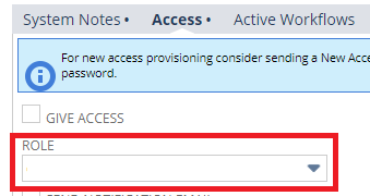 8. Check the Send New Access Notification Email box to notify your customer of this new access. As of 2018.2, the new access notification email includes the user’s email address (used for logging in to NetSuite), the administrator’s email address, and explains login procedures. It also contains a URL so that the customer can set up a NetSuite password. The email containing the link is sent as secure email and comes from NetSuite <nlmailer@netsuite.com>.