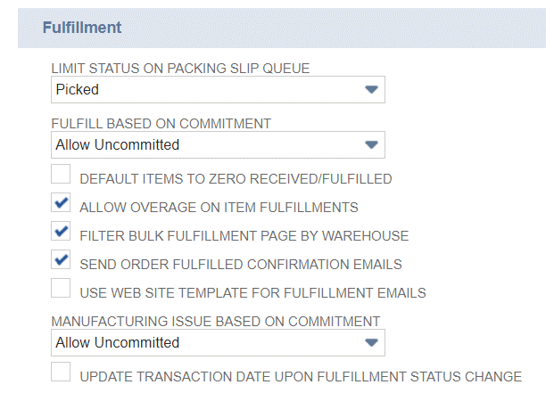 The Send Order Fulfilled Confirmation Emails indicates whether or not you would like the system to automatically generate emails to the address listed on the sales order at the time of fulfillment. The exact trigger for the email is dependent upon a couple of other features/settings, so I recommend reading the field help for this section (accessible by clicking on “Send Order Fulfilled Confirmation Emails”) to understand the various trigger points before setting this preference.