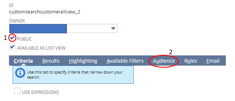 - The Audience subtab allows you to limit access to different roles, employees, departments, etc. You can use one or the other to share access to the saved search.
