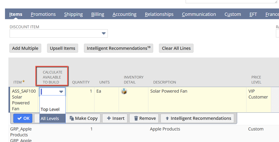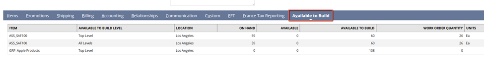 The Available to Build SuiteApp is available for installation on the SuiteApp Marketplace. After installation and minor configuration, a Calculate Available to Build column and corresponding tab become available on Sales Order forms. For a given assembly item or kit/package item, you can calculate Available to Build quantity during order entry using a Top Level or All Levels option. For more information on these two options and calculations involved, refer to this SuiteAnswers article: Available to Build Calculation. After selecting the desired calculation method, results can be viewed on the Available to Build tab on the order record as shown below.