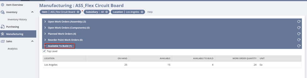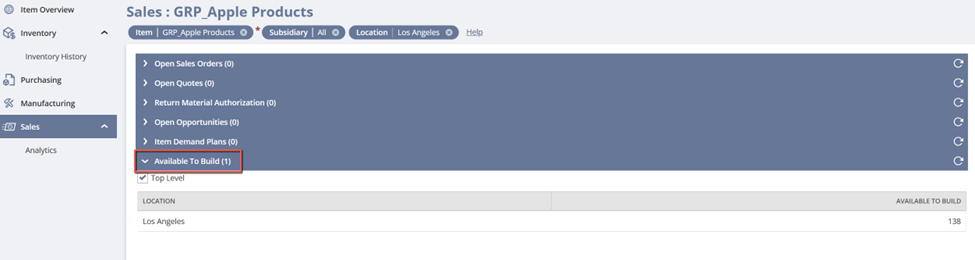 If you utilize NetSuite’s Item 360 Dashboard, you will find the portlet will add Available to Build sections to both Manufacturing and Sales tab.