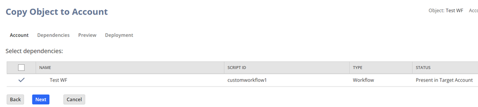 4. Check the Dependencies – After the system calculates the dependencies between the two NS accounts, it will let you know if it is already present in the target account or now. If present, it will update. If not present, it will add a new record.