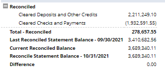 Example: This snapshot is a Reconciliation report where it shows the October bank statement balance and the NetSuite balance is the same after $278,657.55 worth of transactions were added to September’s balance.